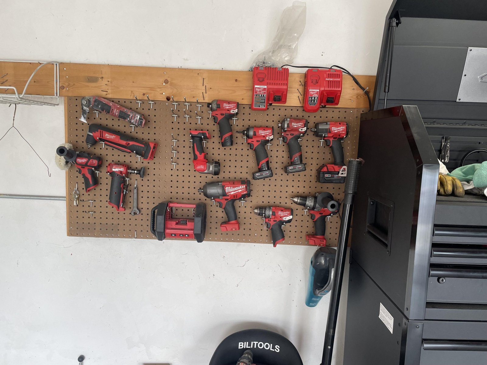 - Use pegboards with hooks to hang tools