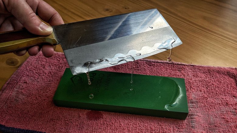 - Place the blade on the sharpening stone.