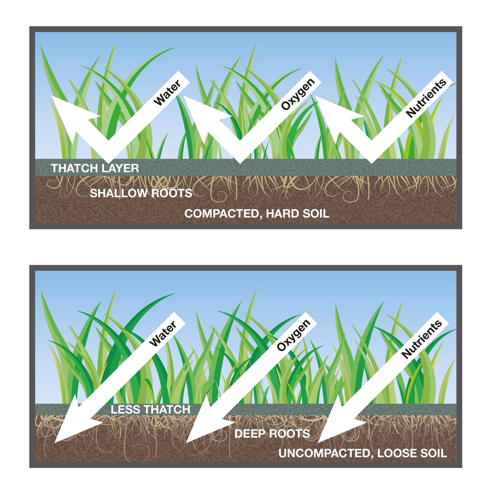 Aeration opens up space in the soil for roots to grow deeper. Roots get more oxygen and nutrients.